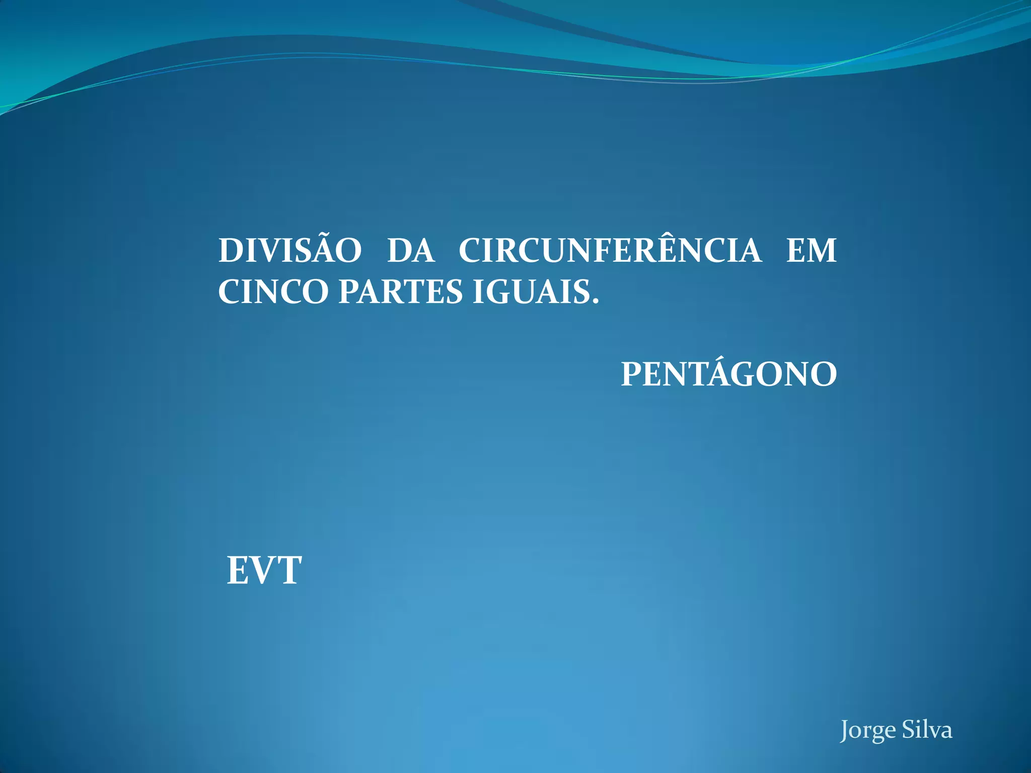 O documento descreve os passos para dividir uma circunferência em cinco partes iguais para formar um pentágono regular. Primeiro, traça-se uma circunferência e um diâmetro. Em seguida, divide-se o diâmetro ao meio e depois divide-se um segmento em mais uma parte. Por fim, marcam-se as cinco partes iguais na circunferência para formar o pentágono.