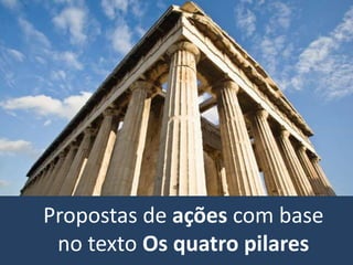 O documento descreve os quatro pilares da educação definidos no Relatório Delors: aprender a conhecer, aprender a fazer, aprender a conviver e aprender a ser. Estes pilares visam o desenvolvimento pleno e integral das pessoas através da aquisição de competências e habilidades.