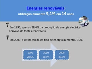 O uso de energias renováveis aumentou 9,1% entre 1995 e 2009, subindo de 28,6% para 38,5% da produção de energia elétrica. O consumo variou significativamente nesse período, atingindo o pico de 46% em 1996 e o mínimo de 19,2% em 2005, aumentando depois para 33,6% em 2006, possivelmente devido a objetivos do Protocolo de Quioto. A fonte mais utilizada foi a energia hidrelétrica.
