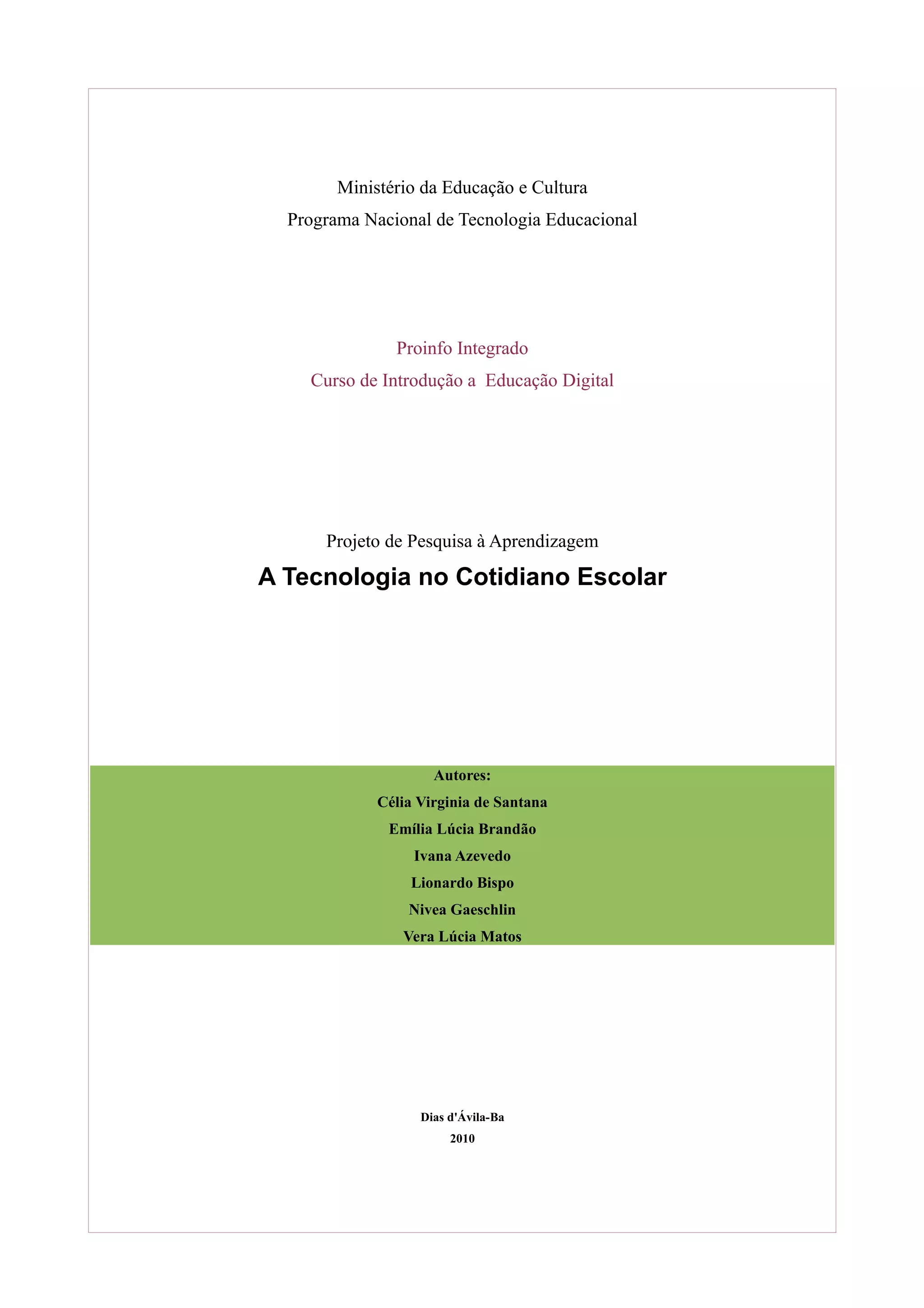Este documento descreve um projeto de pesquisa sobre o uso de tecnologia no cotidiano escolar em escolas de educação infantil e fundamental I na cidade de Dias d'Ávila em 2010. O projeto visa investigar como a tecnologia influencia o letramento digital e a formação cidadã dos alunos, além de debater os prós e contras do uso social das novas tecnologias. As ações incluem pesquisas com alunos, debates sobre tecnologia na escola, levantamento sobre as tecnologias usadas e seus impactos, e divul