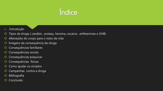 O documento resume os principais tipos de drogas ilícitas, seus efeitos no corpo e mente, e as consequências familiares, sociais, psicológicas e físicas do seu uso. Também discute como ajudar viciados e as campanhas contra a droga.