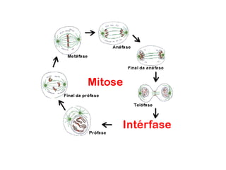 1. O ciclo celular consiste em interfase e divisão celular. A interfase inclui os períodos G1, S e G2 para duplicação de DNA e estruturas celulares. 2. A mitose é o processo de divisão celular, incluindo as fases de prófase, metáfase, anáfase e telófase para distribuir cromossomos entre células filhas. 3. A citocinese envolve a divisão do citoplasma para formar as duas células completas.