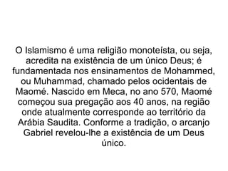 O Islamismo é uma religião monoteísta fundada por Maomé na Arábia Saudita no século VI. Seus seguidores, chamados de muçulmanos, acreditam que Alá é o único Deus e que Maomé é seu profeta. O livro sagrado é o Alcorão, que contém as revelações recebidas por Maomé. Existem duas principais vertentes, sunitas e xiitas, que diferem em questões de liderança política e sucessão após a morte de Maomé.