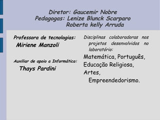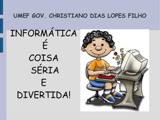 O documento apresenta informações sobre a UMEF Governador Christiano Dias Lopes Filho. Ele lista as disciplinas lecionadas na escola como Informática, Arte, Empreendedorismo e Educação Religiosa. Também apresenta os nomes dos professores e auxiliares responsáveis por cada disciplina.