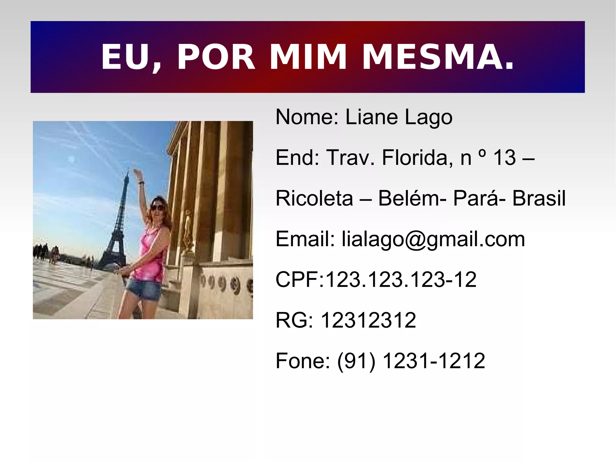 Liane Lago apresenta seus dados pessoais e profissionais. Ela é licenciada em Educação Física e possui especializações em Aprendizagem Motora, Lazer e Relações Raciais. Trabalhou nas escolas E.E.E.F. Girassol e E.M. Abelha Feliz. Gosta de praticar Mountain Bike, Handebol e passar tempo com cinema e viagens. Já produziu um Dicionário Ilustrado e Histórias em Quadrinhos.