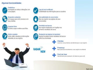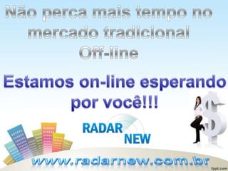 O documento apresenta o Radarnew, um portal que oferece serviços de comércio eletrônico para pequenas e médias empresas. O Radarnew surgiu para permitir que esses empreendedores aproveitem as oportunidades da internet, que antes eram restritas aos grandes varejistas. O portal oferece sites e lojas virtuais compartilhadas, além de marketing e logística em conjunto, permitindo que os clientes tenham condições competitivas no mercado online.