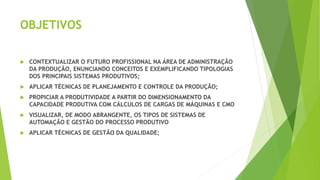 O documento discute sistemas produtivos, definindo conceitos como produção contínua, produção em lotes e produção sob encomenda. Também aborda a evolução histórica dos sistemas produtivos desde a era do artesanato até a produção enxuta contemporânea e tipos de operações como serviços profissionais, lojas de serviço e serviços em massa.