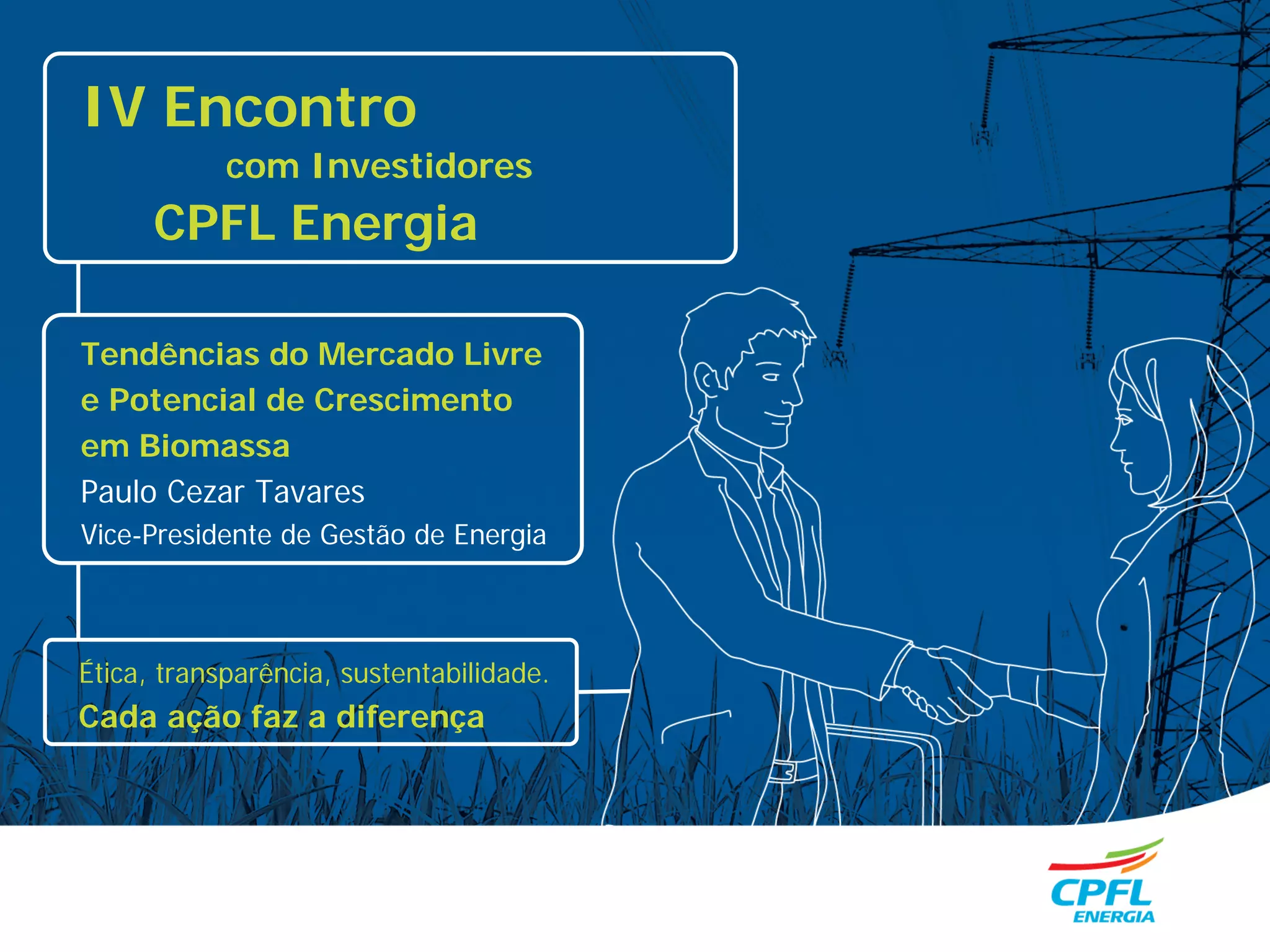 O documento resume a apresentação de Paulo Cezar Tavares, vice-presidente de Gestão de Energia da CPFL Energia, no IV Encontro com Investidores da empresa. O documento discute as tendências do mercado livre de energia e o potencial de crescimento da biomassa no Brasil, além de traçar a história e estratégias da CPFL Energia no segmento de geração a biomassa.