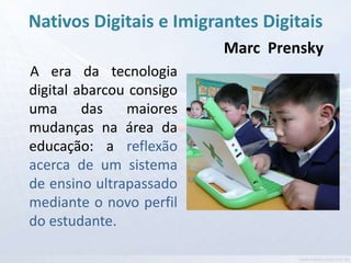 O documento discute as diferenças entre "Nativos Digitais" e "Imigrantes Digitais" no contexto educacional. [1] Nativos Digitais cresceram com tecnologia e têm preferências como gráficos e recompensas imediatas, enquanto Imigrantes Digitais mantêm métodos tradicionais. [2] O documento defende a harmonização de saberes tradicionais e novos saberes no conteúdo e métodos, como usar a linguagem dos alunos e tecnologias digitais. [3] Uma aliança entre