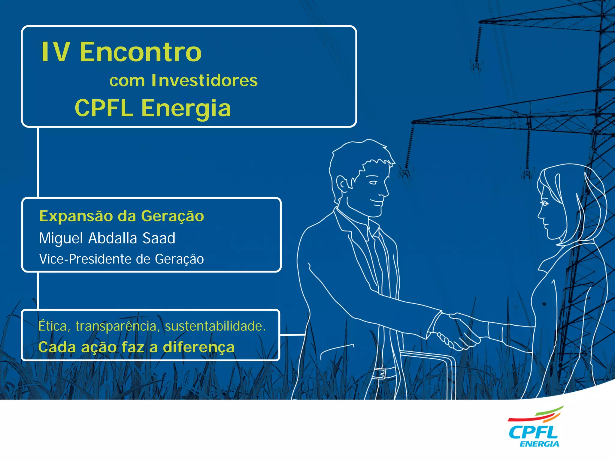 O documento resume três projetos de expansão da geração de energia da CPFL Energia: 1) A usina hidrelétrica de Foz do Chapecó, com 436 MW de potência para a CPFL; 2) O parque eólico de Santa Clara com 188 MW de potência total; 3) As usinas termelétricas de Termonordeste e Termoparaíba com 341,6 MW de potência total. Todos os projetos estão em fase avançada de construção e deverão entrar em operação até o final de 2012.