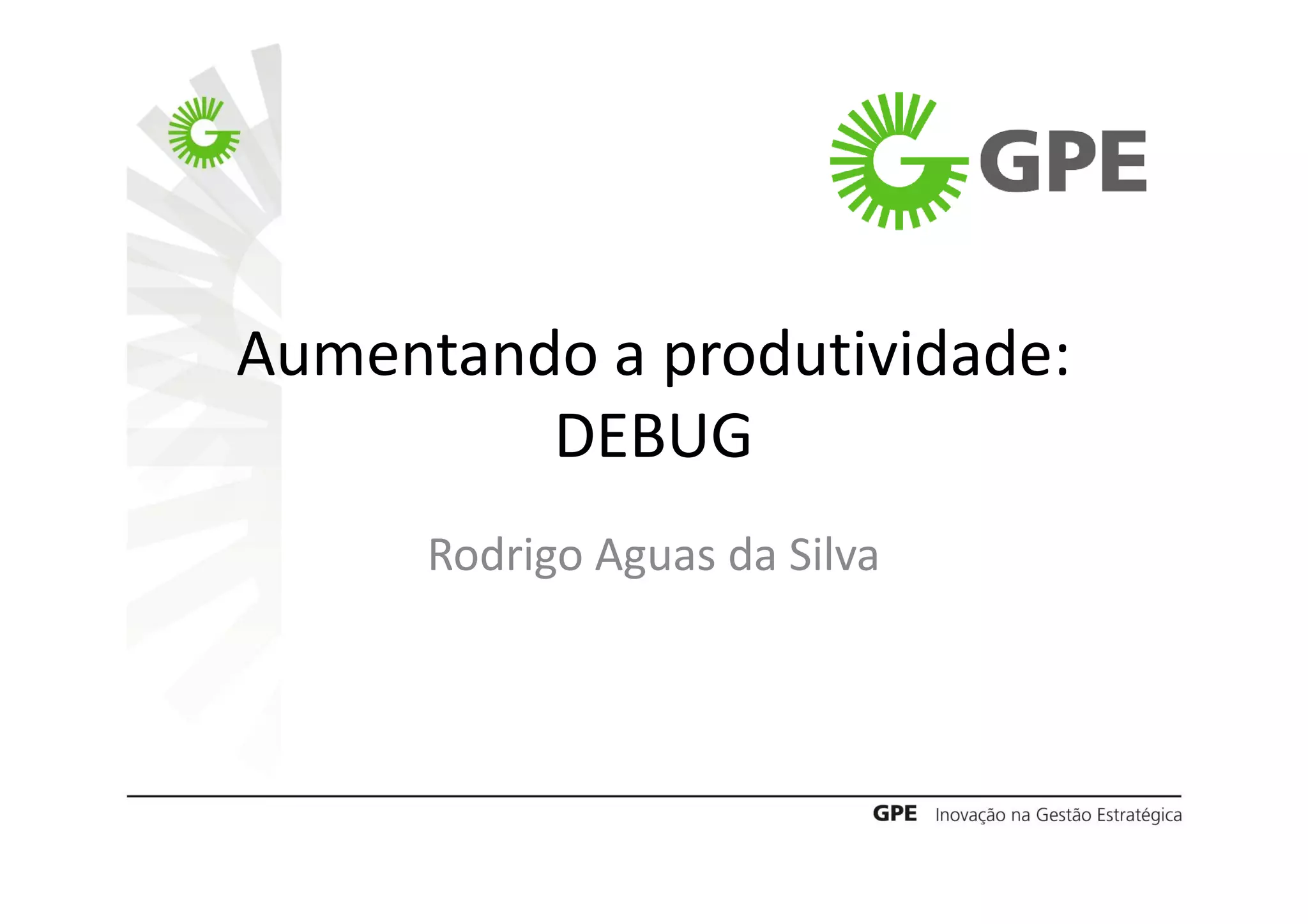 1. O documento discute estratégias para debug e otimização de código de forma eficiente. 2. Recomenda-se usar o método científico para debug: estabilizar o erro, formular hipóteses, testar e corrigir. 3. A otimização deve ser feita após o desenvolvimento, com medições para identificar gargalos e avaliar melhorias.