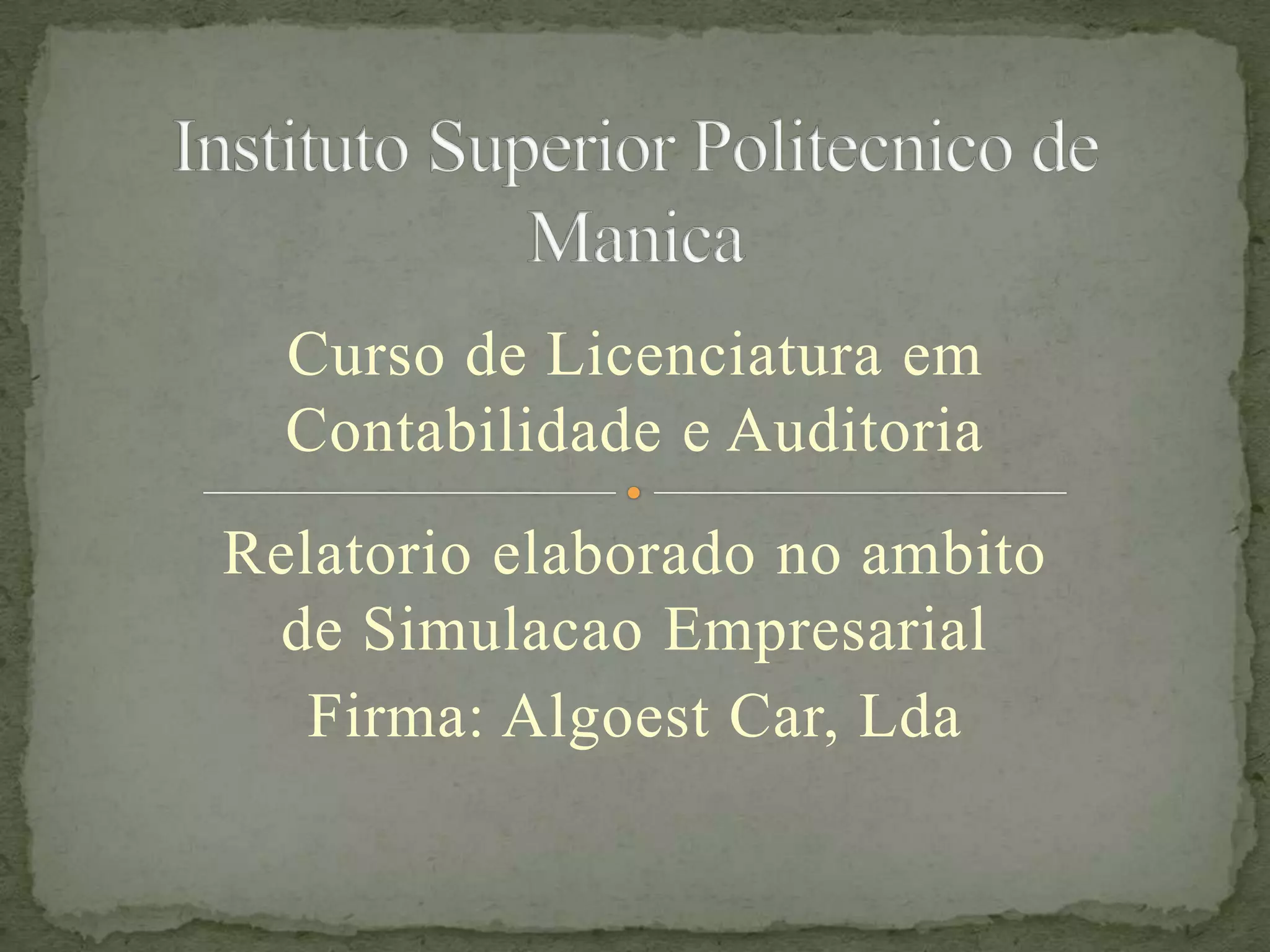 Este relatório descreve uma simulação empresarial de uma empresa de venda de veículos chamada Algoest Car, Lda. O relatório fornece detalhes sobre a estrutura da empresa, seus objetivos, departamentos, políticas de recursos humanos, avaliação de desempenho e desafios financeiros.