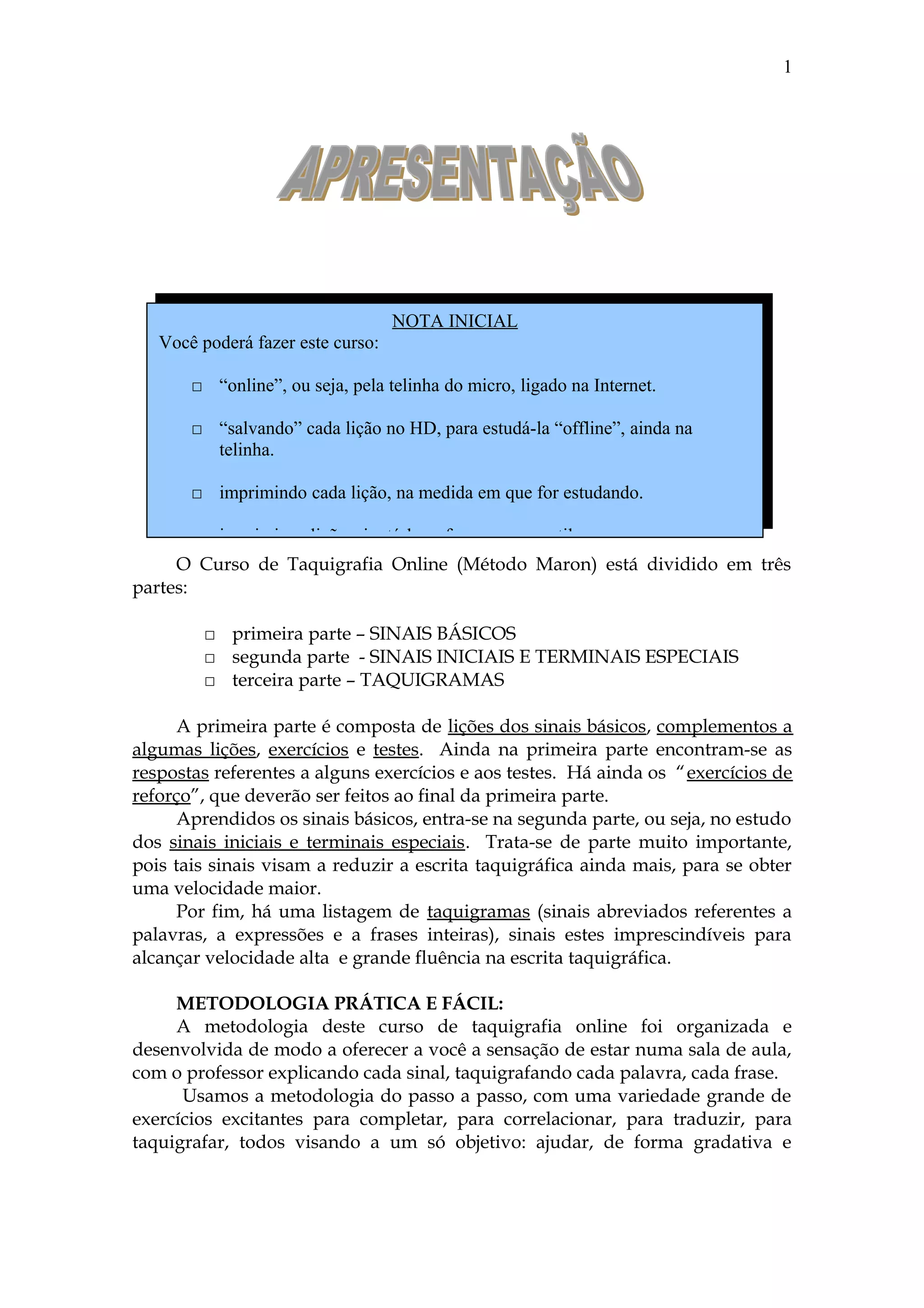 O Curso de Taquigrafia Online está dividido em três partes: sinais básicos, sinais iniciais e terminais especiais, e taquigramas. A primeira parte ensina os sinais básicos através de lições, exercícios e testes. A segunda parte reduz ainda mais a escrita com sinais especiais. A terceira parte lista taquigramas para abreviar palavras e frases.