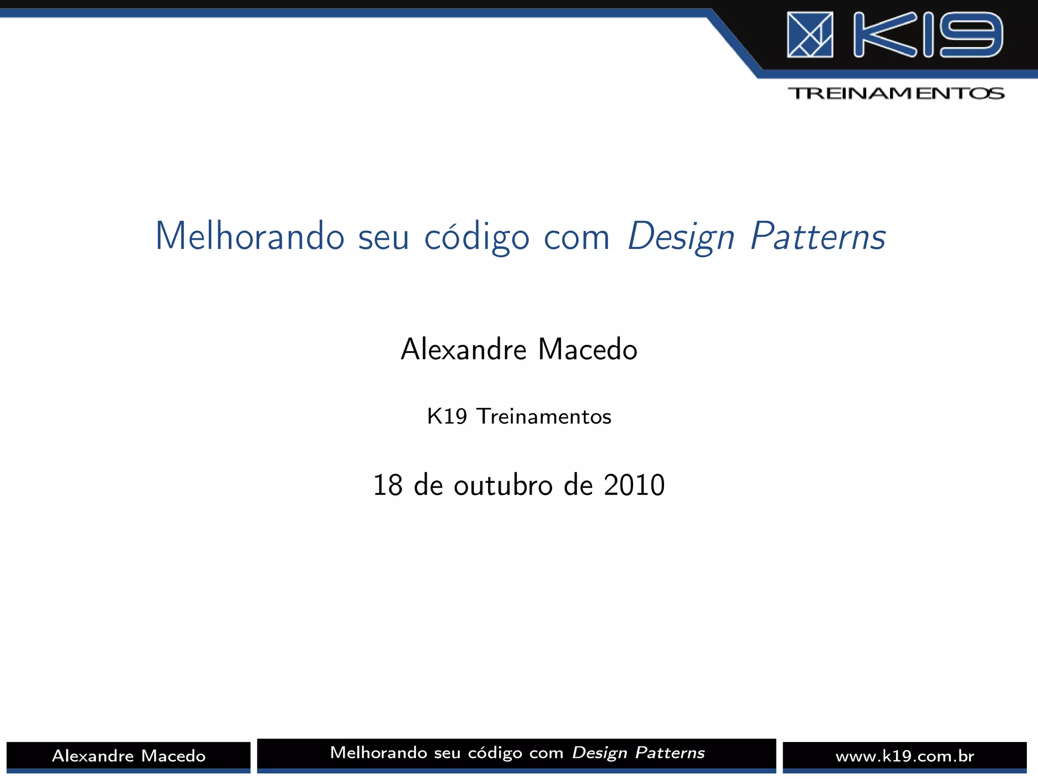 O documento discute Design Patterns, estruturas de projeto reutilizáveis em programação orientada a objetos. Apresenta o que são Design Patterns, incluindo sua popularização após o livro "Design Patterns" de 1994, e lista 23 padrões comuns. Exemplos de Factory Method, Adapter e Observer são explicados detalhadamente ilustrando suas características e aplicações.