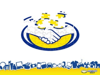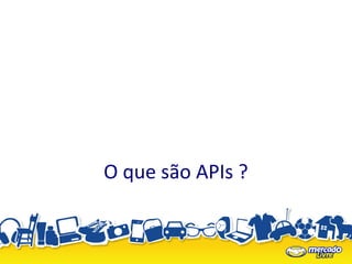 O documento descreve o que são APIs e como o MercadoLivre lançou sua API, permitindo que desenvolvedores incorporem funcionalidades do site em seus próprios sistemas, como fazer uploads em massa de produtos, editar anúncios automaticamente e integrar estoque entre sites.