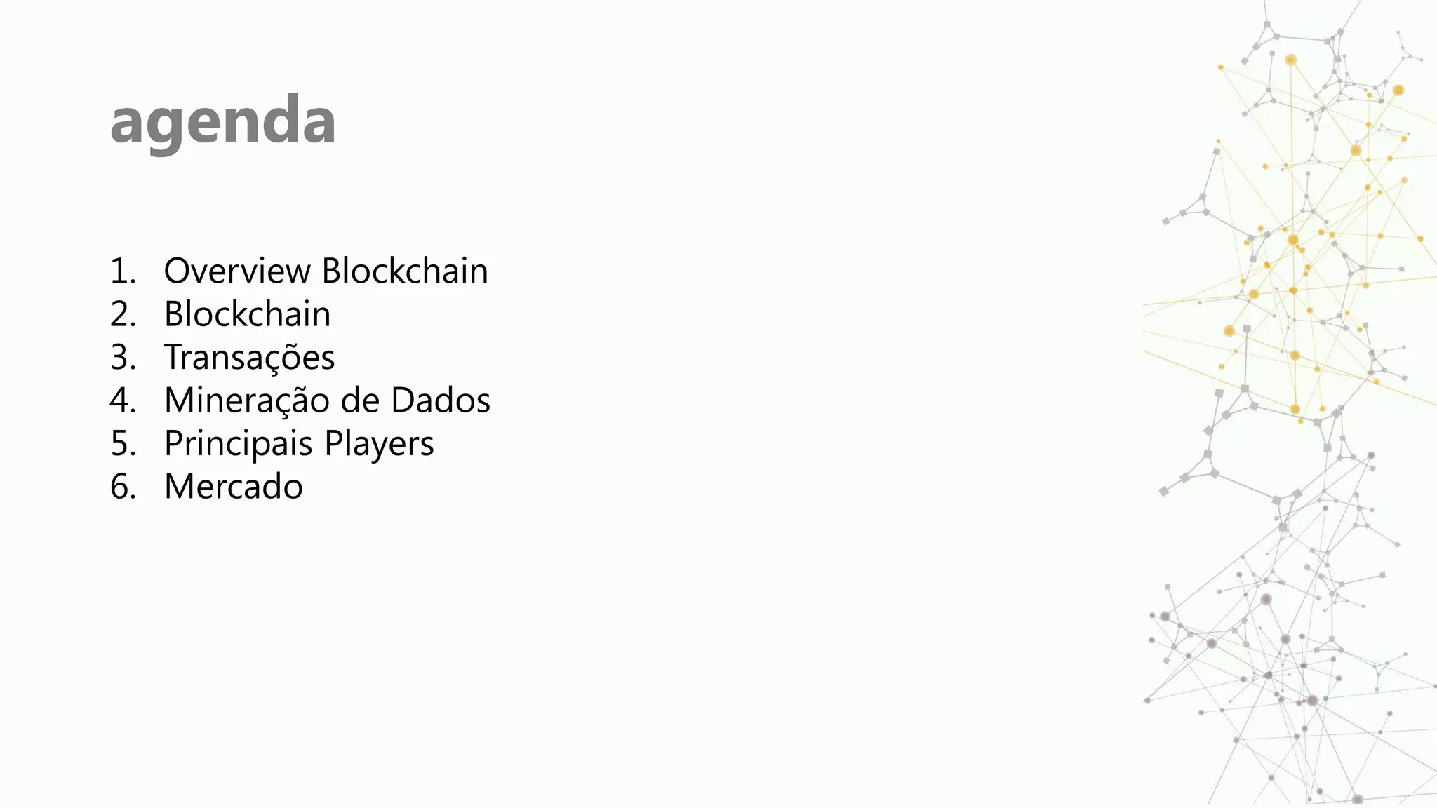 Este documento fornece uma introdução aos conceitos fundamentais de blockchain, incluindo: (1) O que é blockchain e como funciona através de uma cadeia de blocos interligados; (2) Como as transações ocorrem através da transferência do controle de entradas para saídas criptografadas; (3) O processo de mineração, no qual os blocos são resolvidos através de cálculos matemáticos difíceis.
