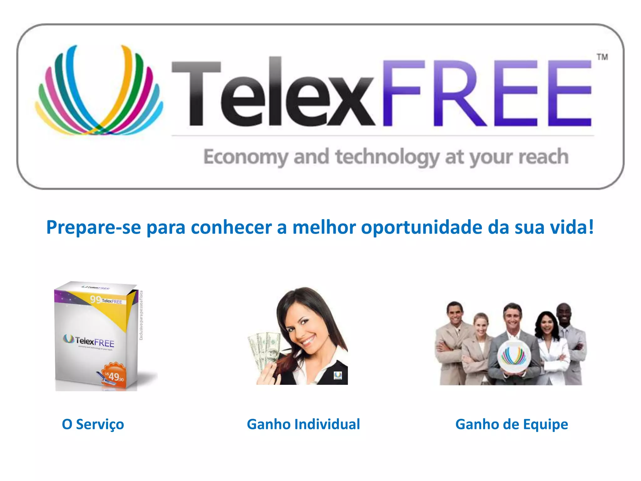 Este documento promove uma oportunidade de negócios chamada Telexfree, que oferece serviços de telefonia via internet e a possibilidade de ganhos por meio de publicidade online e recrutamento de novos membros. O documento detalha diferentes níveis de adesão, bônus e ganhos semanais, mensais e anuais que podem ser obtidos ao recrutar outros participantes e aumentar sua rede.