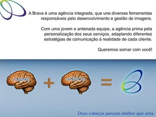 A Brava é uma agência de comunicação integrada que oferece serviços como assessoria de imprensa, comunicação institucional, gestão de mídias sociais, edição e produção de conteúdo para ajudar empresas a melhorarem sua imagem e relacionamento com clientes e públicos. A agência tem uma equipe jovem e criativa que se adapta às necessidades de cada cliente.