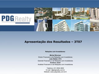 Este documento apresenta os resultados financeiros e operacionais da PDG Realty para o terceiro trimestre de 2007, destacando o crescimento das vendas, lançamentos e do lucro operacional, assim como novas parcerias estratégicas firmadas pela companhia.