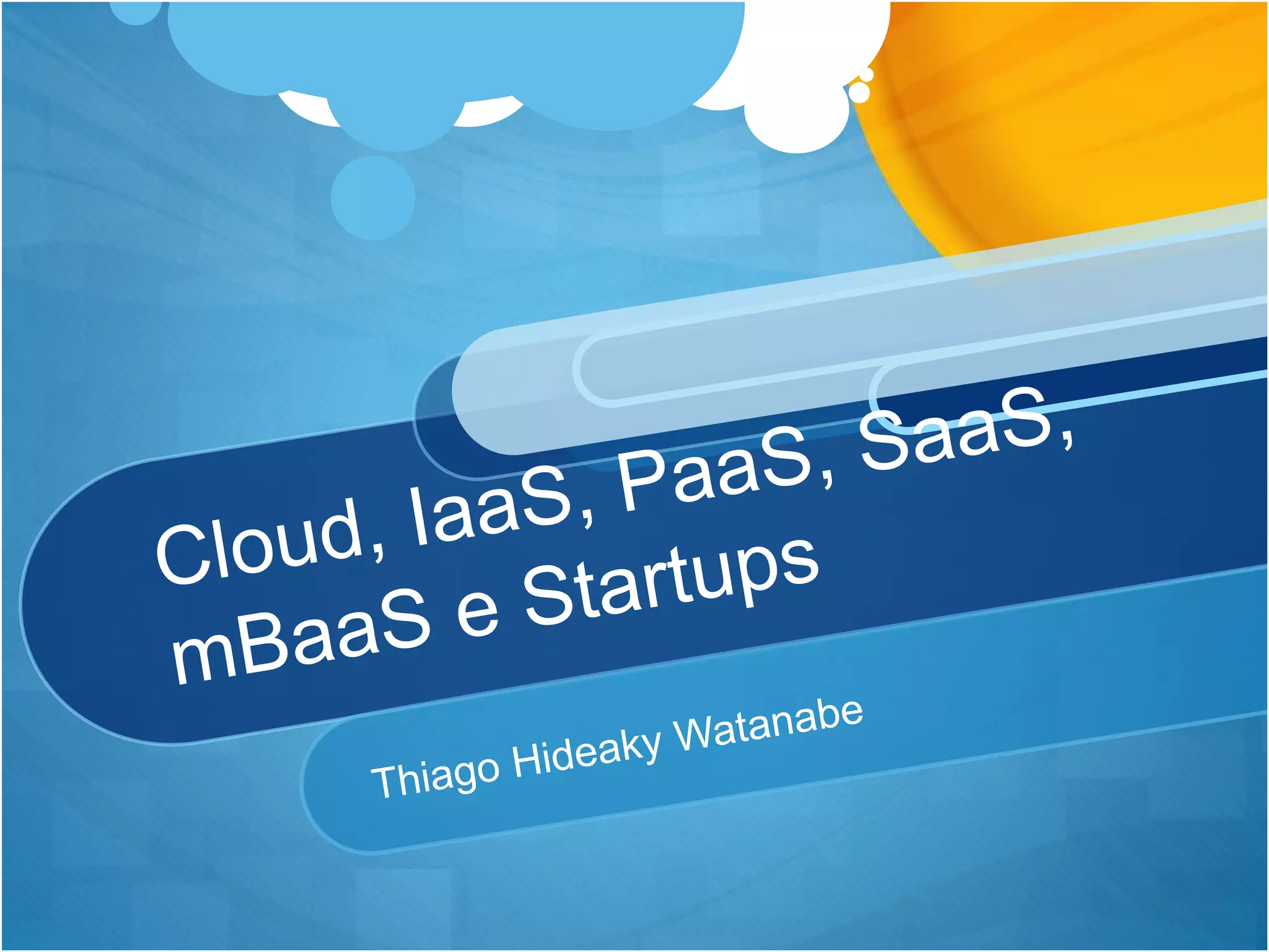 O documento discute a origem e evolução do cloud computing, definindo suas principais categorias (IaaS, PaaS, SaaS, mBaaS) e benefícios como flexibilidade, colaboração e redução de custos. Também apresenta exemplos de como startups utilizam serviços na nuvem para focar no desenvolvimento do produto em vez de infraestrutura.