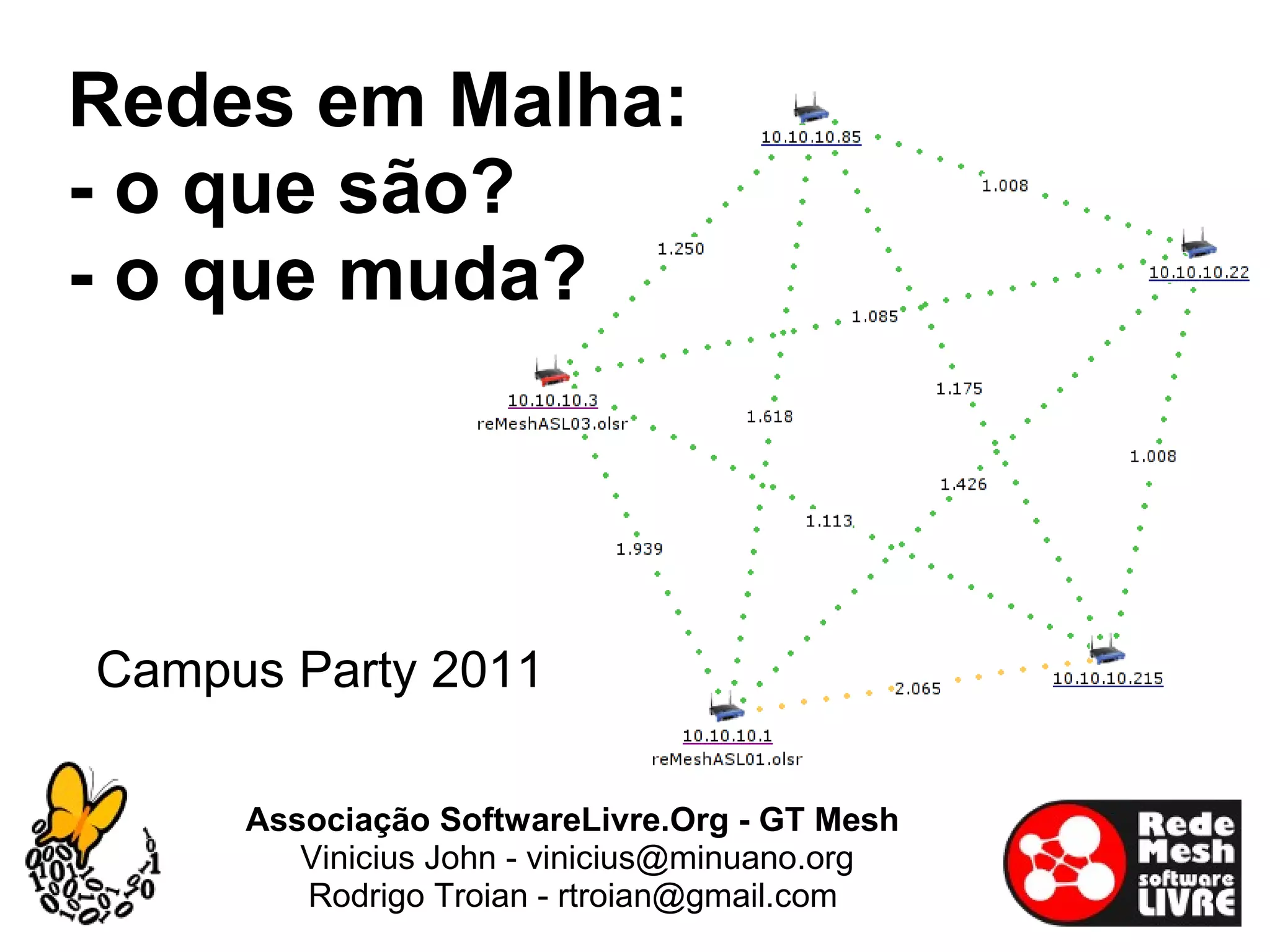 Redes em malha são redes sem fio que operam em topologia de malha, permitindo roteamento dinâmico entre nós. Isso pode levar a implantação de redes públicas e inclusão digital a áreas rurais e periferias com menor custo, além de uso em eventos. Protocolos como OLSR e B.A.T.M.A.N. especificam o funcionamento dessas redes.