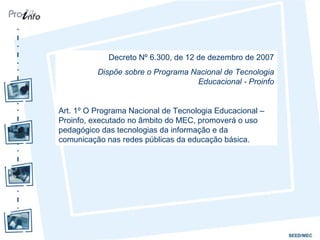 Este documento descreve um curso de formação continuada para professores sobre tecnologia educacional no Brasil. O curso ensina professores habilidades básicas de TI, como processamento de texto, apresentações, pesquisa on-line e comunicação. Ele é composto por 40 horas de aulas presenciais e à distância sobre tópicos como segurança on-line e ferramentas educacionais como blogs. A avaliação inclui participação, postagem de atividades e um trabalho final de grupo.
