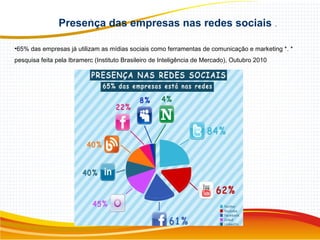 O documento discute o uso das redes sociais pelas empresas, mencionando que 65% das empresas já usam as mídias sociais para comunicação e marketing. Também destaca exemplos de como marcas como Starbucks, Coca-Cola, Red Bull e Oreo usam ativamente as redes sociais para se engajar com os clientes e promover suas marcas.