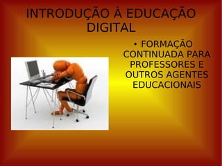 O documento descreve um curso de formação continuada para professores e agentes educacionais sobre introdução à educação digital, cobrindo tópicos como editor de textos, planilhas eletrônicas, apresentações de slides, internet, blogs e outros recursos digitais. O curso tem carga horária de 40 horas e os participantes receberão um certificado ao final. Interessados podem se inscrever no site do MEC.
