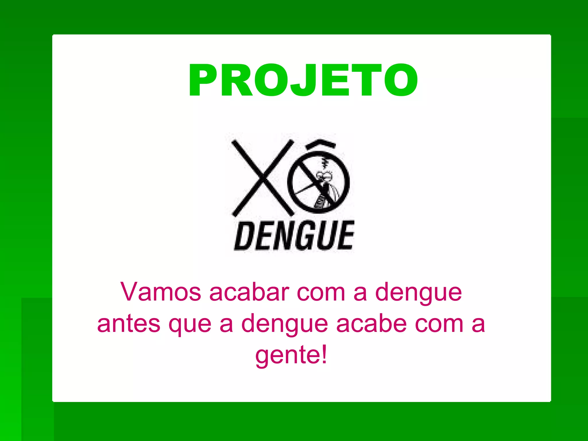 O documento descreve o que é dengue, seu transmissor (o mosquito Aedes aegypti) e sintomas. A dengue pode ser clássica ou hemorrágica. O tratamento é de suporte com repouso, ingestão de líquidos e medicamentos prescritos. É importante combater o mosquito eliminando seus focos de reprodução.