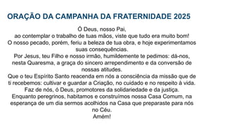 A oração da Campanha da Fraternidade 2025 convoca à conversão e à solidariedade em tempos de crise socioambiental, enfatizando a importância do cuidado com a Criação. Os objetivos incluem reconhecer ações anteriores, denunciar problemas ambientais, promover uma ecologia integral e incentivar a justiça socioambiental. A Campanha busca refletir sobre a relação do ser humano com a natureza e a necessidade de mudanças éticas e comportamentais para preservar a casa comum.