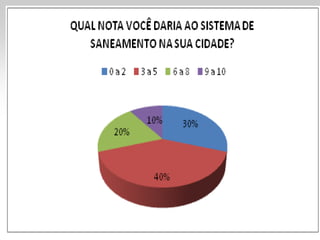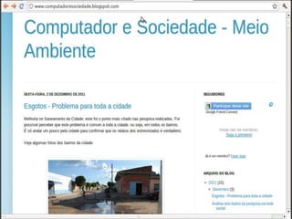 Este documento apresenta um blog sobre meio ambiente e saneamento nas cidades de Trindade e Ouricuri. O blog foi criado por quatro alunos e tem como objetivo tratar de assuntos relacionados ao meio ambiente e saneamento nessas cidades, apresentando resultados de pesquisas. As pesquisas apontaram problemas como esgoto a céu aberto, coleta de lixo e poluição como os principais desafios ambientais nas cidades.