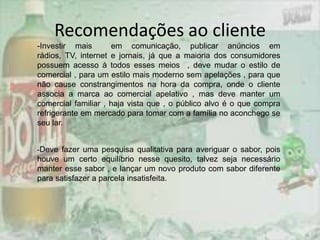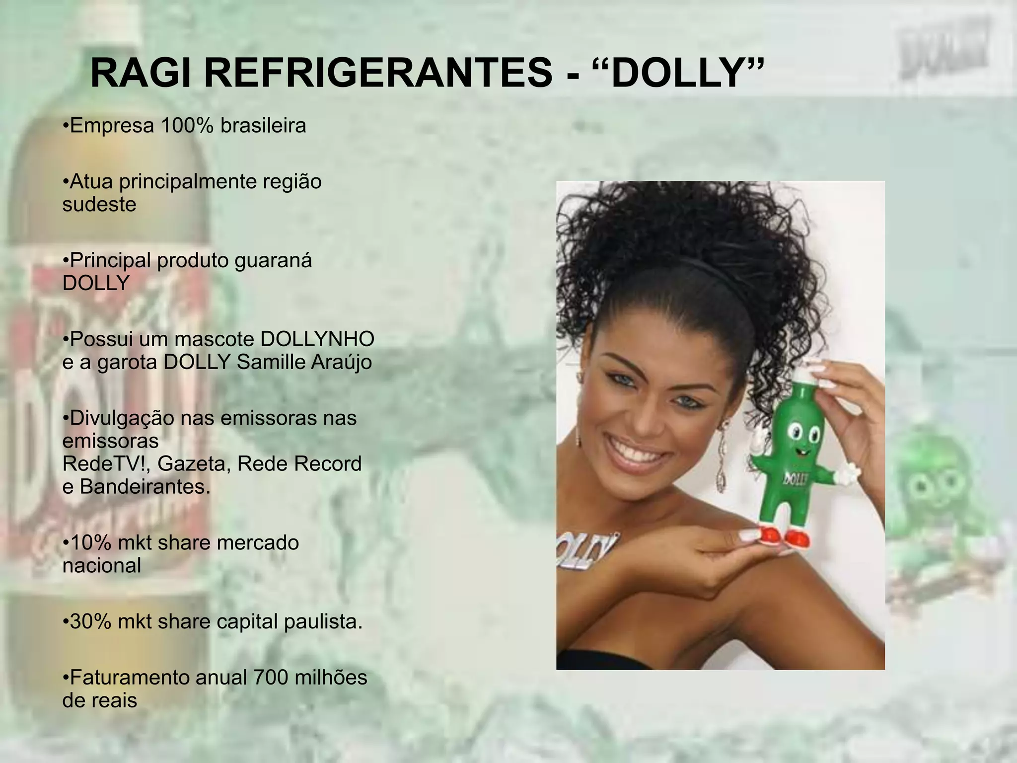 O documento resume uma pesquisa sobre a percepção de consumidores sobre a marca de refrigerante Dolly. A Dolly tem 10% de participação no mercado nacional e 30% no mercado paulista, porém sua comunicação pode ser melhorada, já que apenas 39% dos entrevistados avaliaram positivamente os comerciais atuais. A pesquisa recomenda que a Dolly invista mais em comunicação e mude o estilo de seus comerciais, além de lançar novos sabores para atingir mais consumidores.
