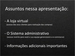 O documento apresenta a plataforma de e-commerce Brasil na Web, com recursos para gestão e estilização de lojas virtuais, incluindo integração com diversos métodos de pagamento e opções de envio. Destaca funcionalidades como SEO otimizado, sistema de afiliados, e suporte contínuo para usuários. Além disso, oferece um sistema administrativo completo e a possibilidade de personalização conforme as necessidades do negócio.