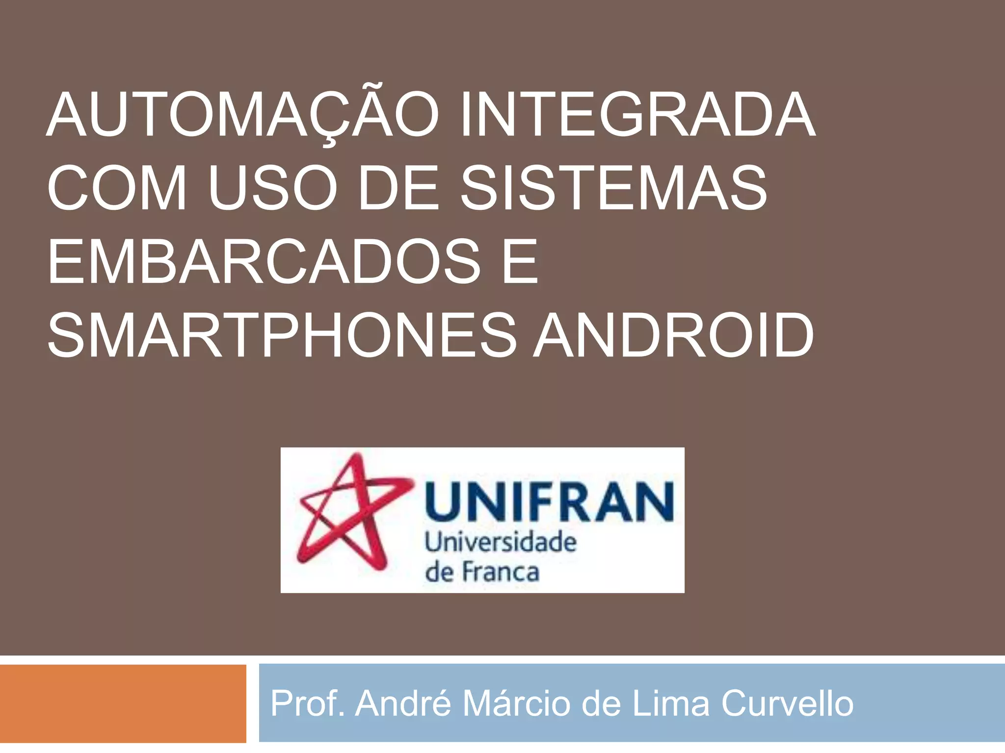 [1] O documento discute a automação integrada usando sistemas embarcados e smartphones Android. [2] É apresentado o que são sistemas embarcados e a plataforma Arduino, com possibilidades de automação usando Arduino. [3] Também é discutida a integração entre Arduino e Android, permitindo o controle remoto através de smartphones.