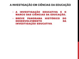 Este documento descreve a evolução histórica da pesquisa educacional e seu desenvolvimento nas ciências da educação. Ele discute quatro períodos principais no desenvolvimento da pesquisa educacional e fornece exemplos de contribuições importantes de diferentes países em cada período. Também classifica as diferentes áreas de ciências da educação e descreve as funções da pesquisa educacional.