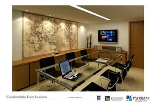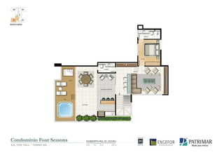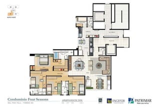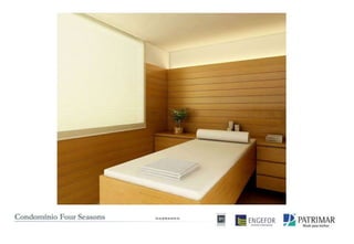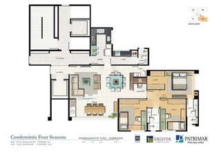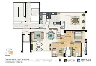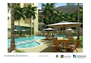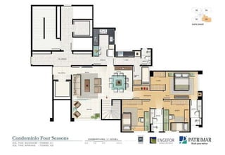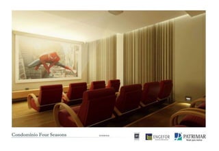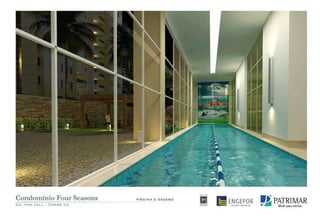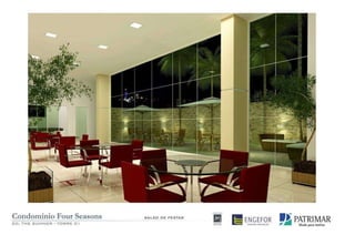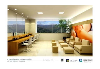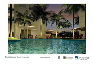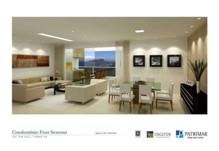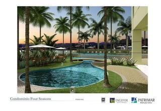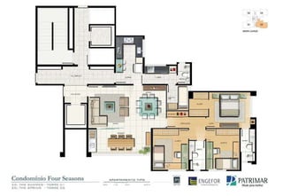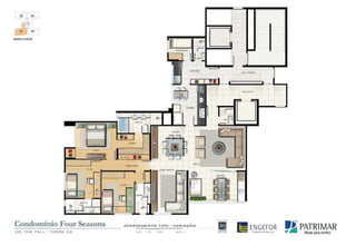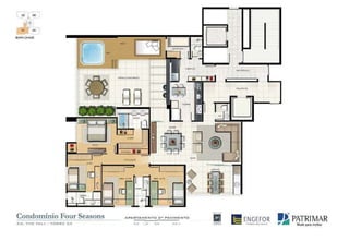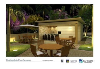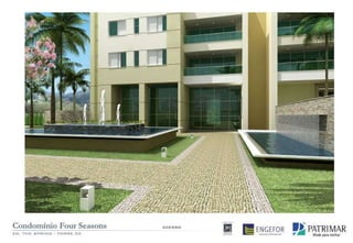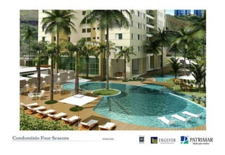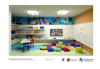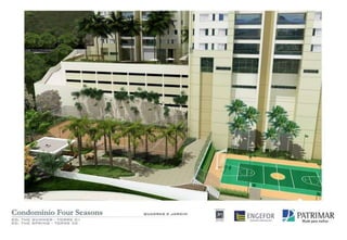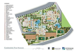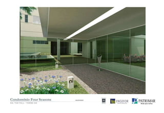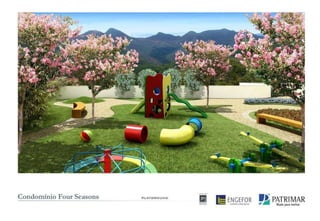 O documento descreve o empreendimento 'Edifício The Summer', 'The Spring' e 'The Fall' na Vila da Serra, Belo Horizonte, com opções de apartamentos de 3 e 4 quartos. O projeto inclui 13.687 m² de terreno, 3 torres, lazer completo com diversas opções de entretenimento e segurança. Detalhes adicionais incluem áreas para atividades físicas, espaços infantis e áreas de convivência.