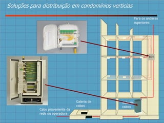O documento descreve um projeto de rede FTTH para fornecer serviços como telefonia, TV e internet para unidades residenciais utilizando uma única fibra óptica. O projeto visa oferecer banda larga de alta capacidade de forma estável e a prova de futuro com menor custo em comparação com redes wireless ou comutadas.