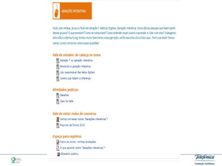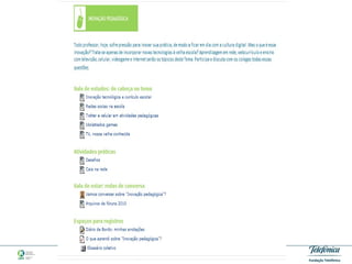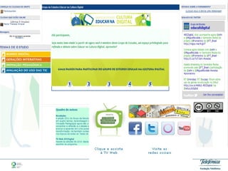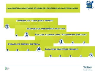 O documento descreve um grupo de estudos online chamado "Educar na Cultura Digital" que reúne educadores interessados em debater temas relacionados à educação e tecnologia. O grupo oferece materiais de apoio, atividades práticas e espaços para discussão em uma plataforma online. Relatos de participantes demonstram o valor que encontram no intercâmbio de experiências proporcionado pelo grupo.