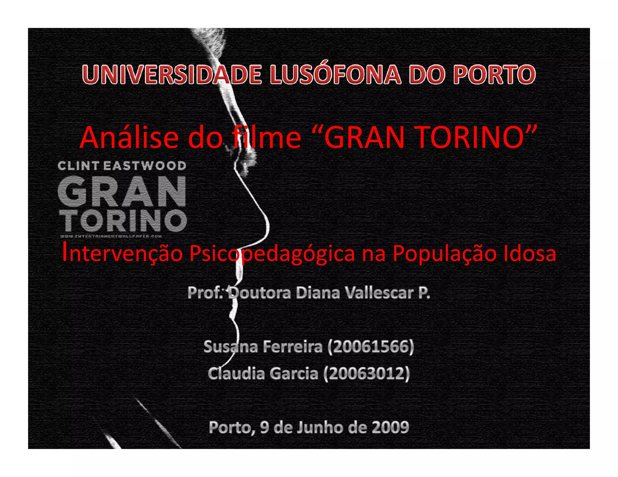 Este documento resume um filme chamado "Gran Torino" e discute uma intervenção psicopedagógica para a população idosa. Ele fornece detalhes sobre a trama, elenco, contextos e modelos terapêuticos que poderiam ser usados, como terapia individual focada em atividades manuais devido ao interesse de Walt em trabalhos com ferramentas.