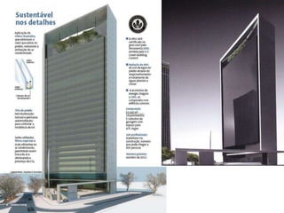 O documento discute conceitos de arquitetura sustentável e bioarquitetura, apresentando exemplos de edifícios sustentáveis ao redor do mundo. Aborda também certificações ambientais como LEED e AQUA e benefícios e desafios da arquitetura sustentável.