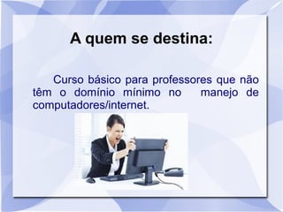 O documento apresenta um curso básico de educação digital voltado para professores sem domínio em tecnologia. Seus objetivos incluem capacitar esses educadores a utilizar recursos tecnológicos e promover a inclusão digital. O conteúdo abrange desde o básico sobre computadores até ferramentas de produtividade e elaboração de trabalhos multimídia.