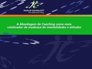 O documento discute como a abordagem do coaching pode promover mudanças de mentalidade e atitudes no contexto educativo, permitindo a auto-descoberta. Ele explora como o coaching pode transformar as relações entre professores, alunos e escola, e desenvolver uma nova autoconsciência nos alunos.