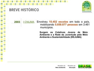Este documento descreve a IV Conferência Nacional Infantojuvenil pelo Meio Ambiente no Brasil, que teve como objetivo tornar as escolas participantes em espaços educadores sustentáveis. O tema foi "Vamos Cuidar do Brasil com Escolas Sustentáveis" e abordou temas como ar, terra, água, fogo e gestão/currículo/espaço físico. O processo ocorreu de 2011 a 2013 e envolveu diagnósticos, projetos de intervenção e priorização de ações para a sustentabilidade nas escolas.