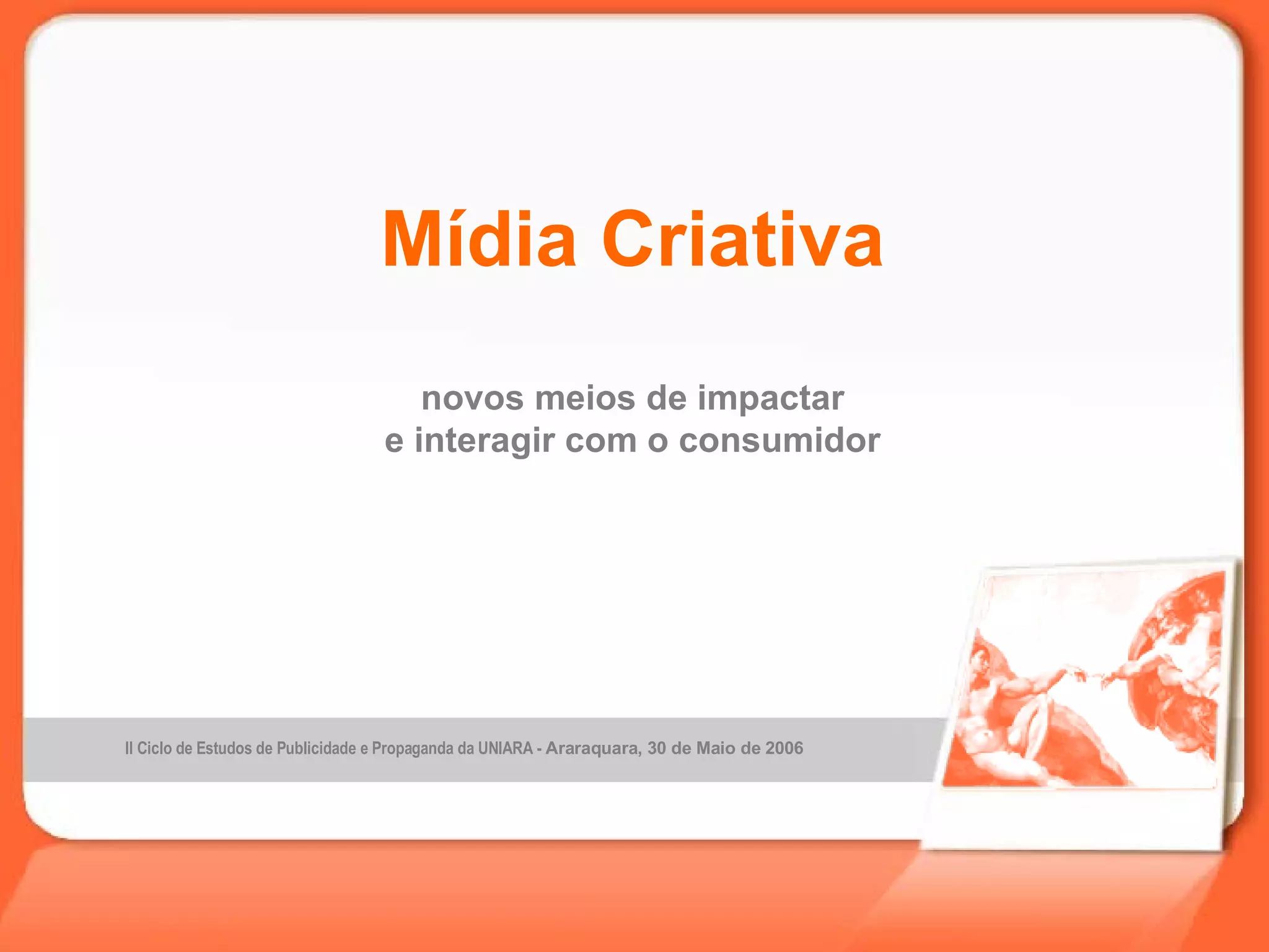 O documento discute novos meios de comunicação digital como mobile marketing, podcasts, blogs e outras plataformas que permitem interação com consumidores. Ele também apresenta casos de campanhas de marketing que usaram esses novos canais de forma integrada com outras mídias para engajar audiências móveis.