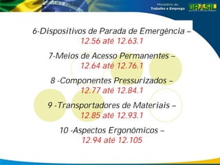 O documento discute a Norma Regulamentadora 12, que estabelece requisitos de segurança para máquinas e equipamentos. A NR 12 foi atualizada em 2010 para incorporar avanços tecnológicos e normas internacionais. Ela define princípios gerais de segurança e medidas de proteção coletiva, administrativa e individual. Também descreve sistemas de segurança como proteções fixas e móveis e dispositivos de segurança.
