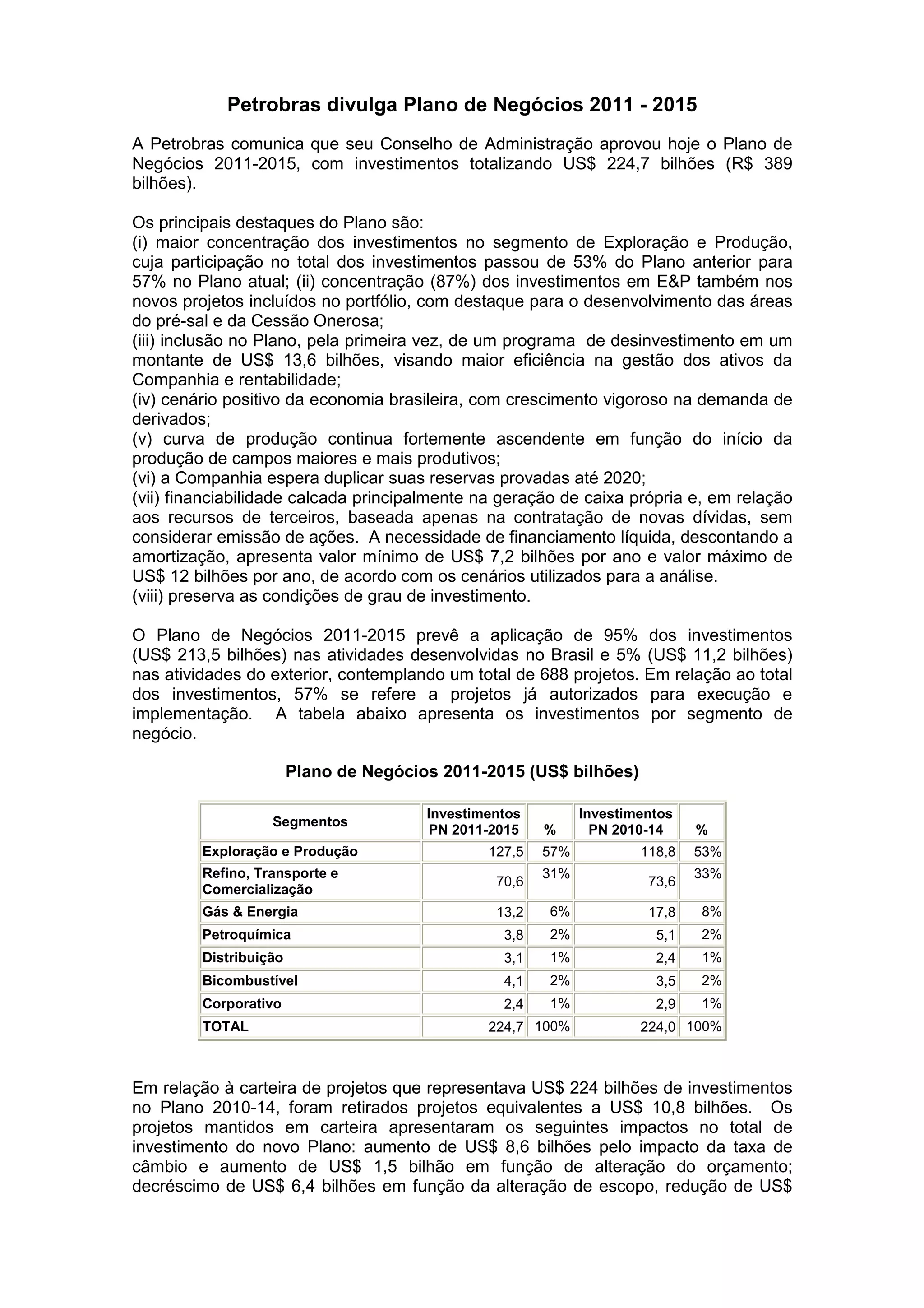 O Plano de Negócios 2011-2015 da Petrobras prevê investimentos de US$ 224,7 bilhões, concentrando 57% no segmento de Exploração e Produção, com foco no pré-sal. A produção deverá duplicar até 2020, atingindo 6,4 milhões de barris/dia, com 40,5% proveniente do pré-sal. O plano também prevê expansão da capacidade de refino para atender o crescimento da demanda brasileira.
