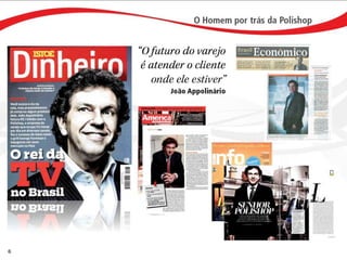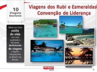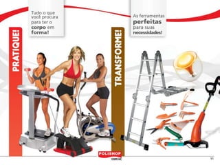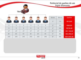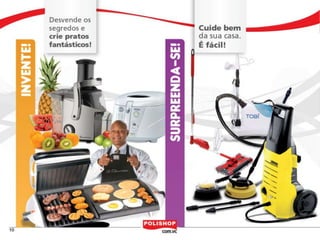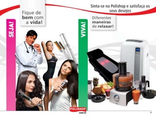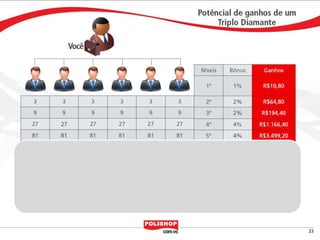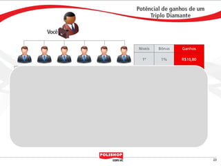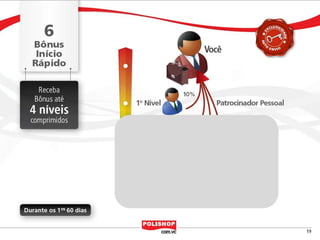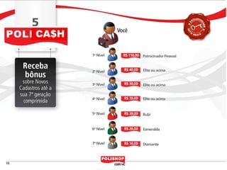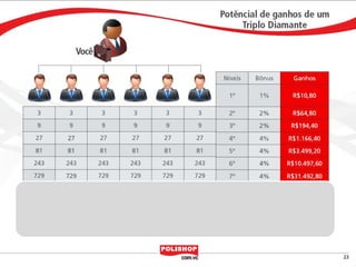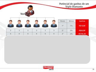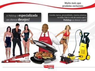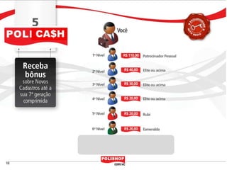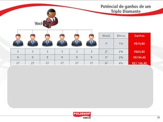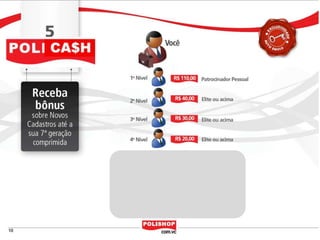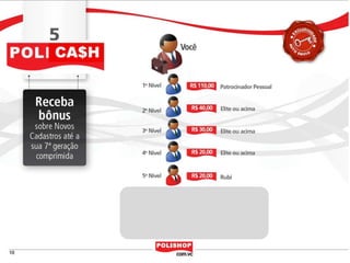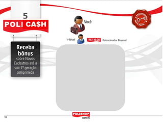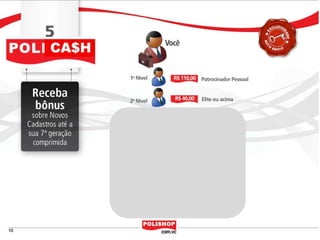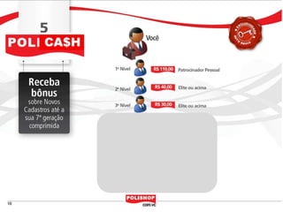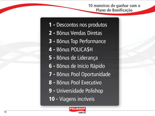 O documento descreve como iniciar uma franquia pessoal com a Polishop, apresentando informações sobre comissões, bônus e o processo de cadastro. Ele detalha as maneiras de acumular pontos e os benefícios financeiros de vendas e compras. Além disso, orienta sobre treinamentos e ferramentas de apoio disponíveis para novos empreendedores.