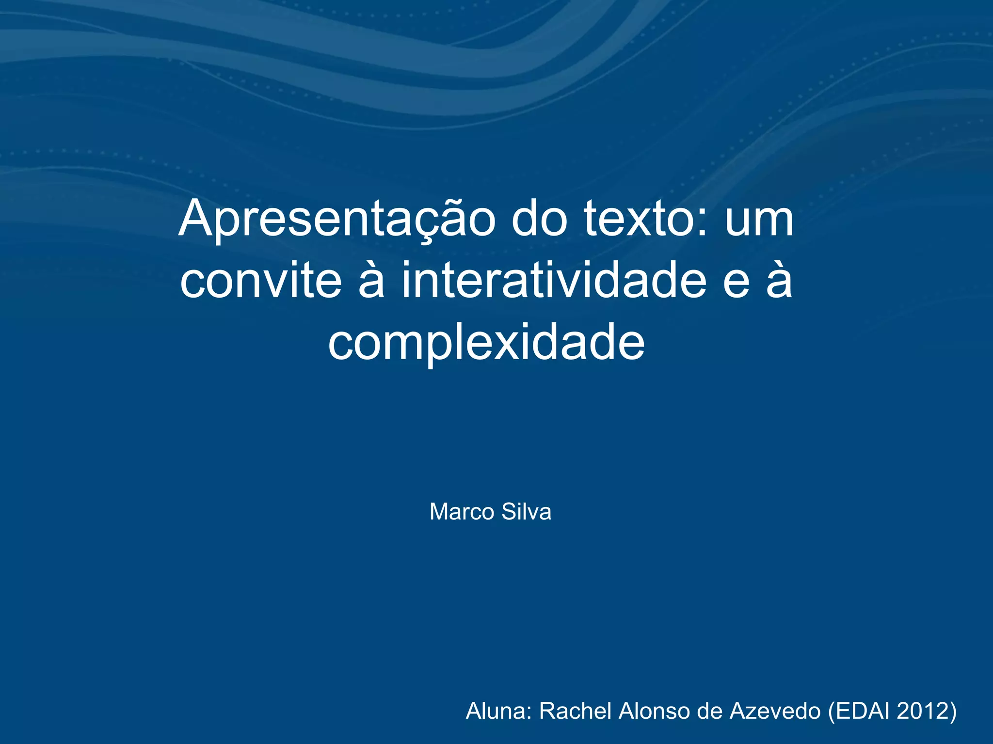 O documento discute o conceito de interatividade e sua relação com a educação. Apresenta as principais críticas ao termo e define interatividade como um fenômeno complexo que emerge na sociedade da informação e reconfigura as comunicações humanas. Também discute como o hipertexto pode ser considerado interativo e apresenta a epistemologia da complexidade de Edgar Morin, com foco nas interações.