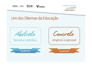 O documento aborda a integração da tecnologia no processo de ensino-aprendizagem, destacando a importância do engajamento ativo dos alunos. Apresenta o projeto da Escola Digital de Turno Integral, que implementou uma nova abordagem curricular com o uso de tecnologia e robótica. O enfoque está na construção de projetos significativos que incentivem a curiosidade e o aprendizado colaborativo entre professores e alunos.