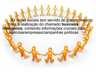 As redes sociais podem fornecer informações valiosas para empresas através do business intelligence. Essas informações incluem identificar demografias e opiniões sobre marcas, acompanhar a disseminação de ideias e rumores, e obter feedback sobre como produtos são percebidos globalmente. As redes sociais oferecem um canal direto com clientes para que empresas possam responder rapidamente.